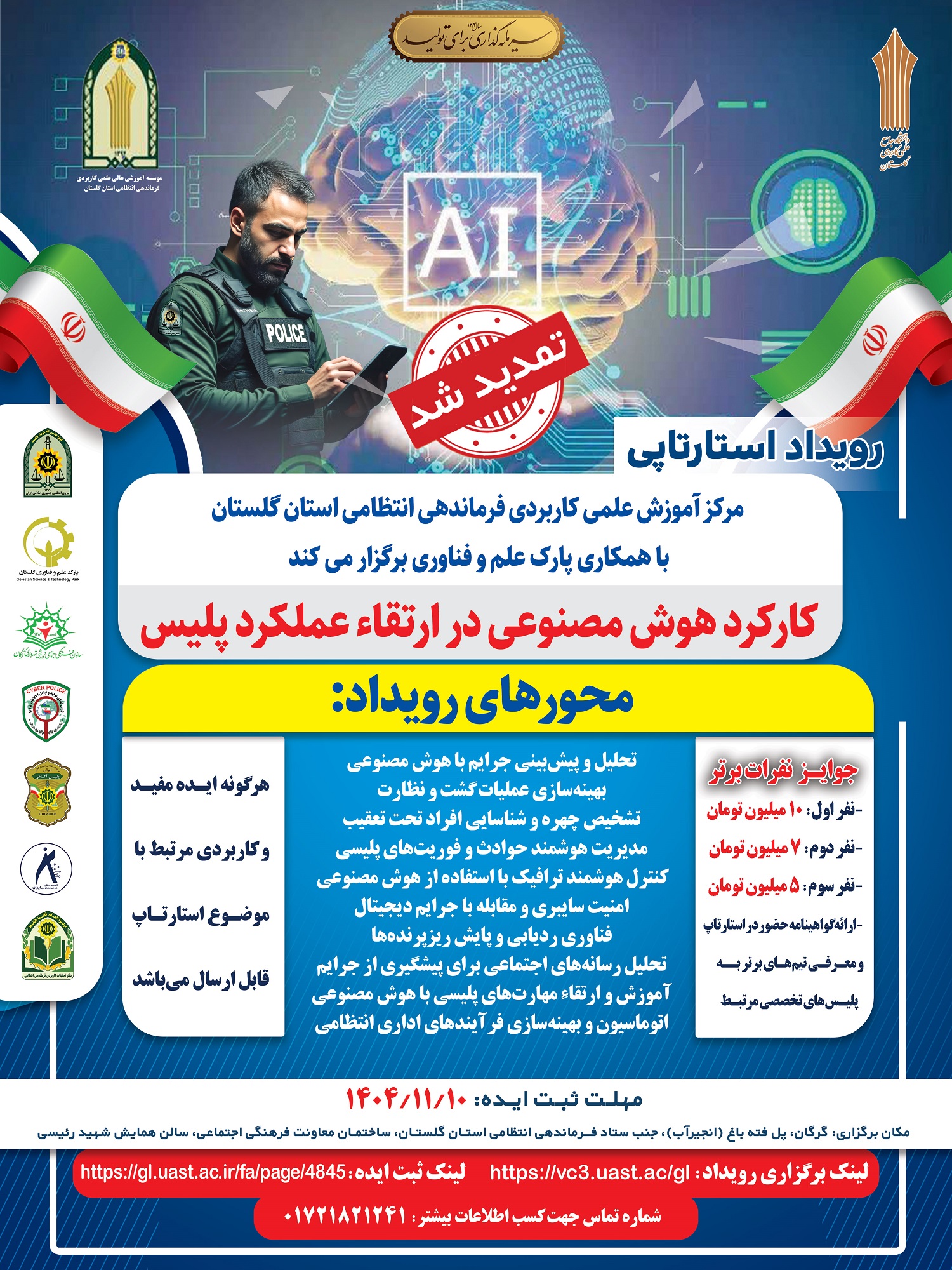 رویداد استارتاپی مرکز آموزش علمی کاربردی فرماندهی انتظامی استان گلستان تعداد بازدید:۶۲۳ ارسال به دیگران نام شما ایمیل شما ایمیل دریافتکننده ارسال انصراف لینک محورهای رویداد استارتاپی لینک ثبت نام رویداد استارتاپی کارکرد هوش مصنوعی در ارتقاء عملکرد پلیس